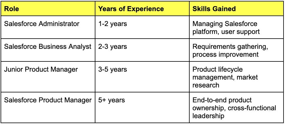 Career Progression Timeline: On average, professionals reach Salesforce Product Manager roles within 4 years of entering the ecosystem, with those having prior product experience accelerating to 2-3 years.